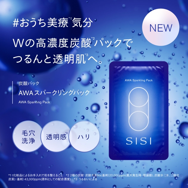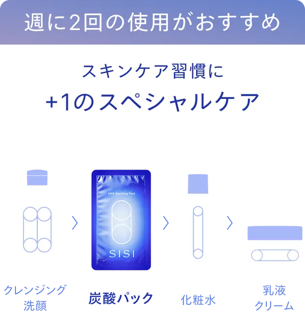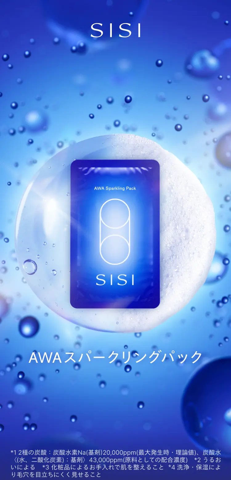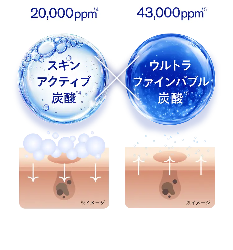*1 2種の炭酸:炭酸水素Na(基剤)20,000ppm(最大発生時・理論値)、炭酸水〈(水、二酸化炭素):基剤〉43,000ppm(原料としての配合濃度) *2 洗浄・保湿により毛穴を目立ちにくく見せること *3 うるおいによる *4 炭酸水素Na(基剤)20,000ppm(最大発生時・理論値)*5 炭酸水〈(水、二酸化炭素):基剤〉43,000ppm(原料としての配合時濃度)